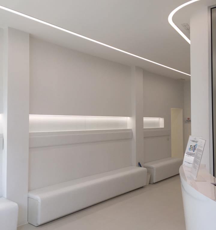 Un progetto in cui le linee pulite e arrotondate, creano accoglienza e operatività e i materiali si mixano in un Total White 9003, in cui la luce regala un comfort visivo ed emozionale oltre che altamente qualitativo per gli operatori di questo Centro Dentale innovativo.